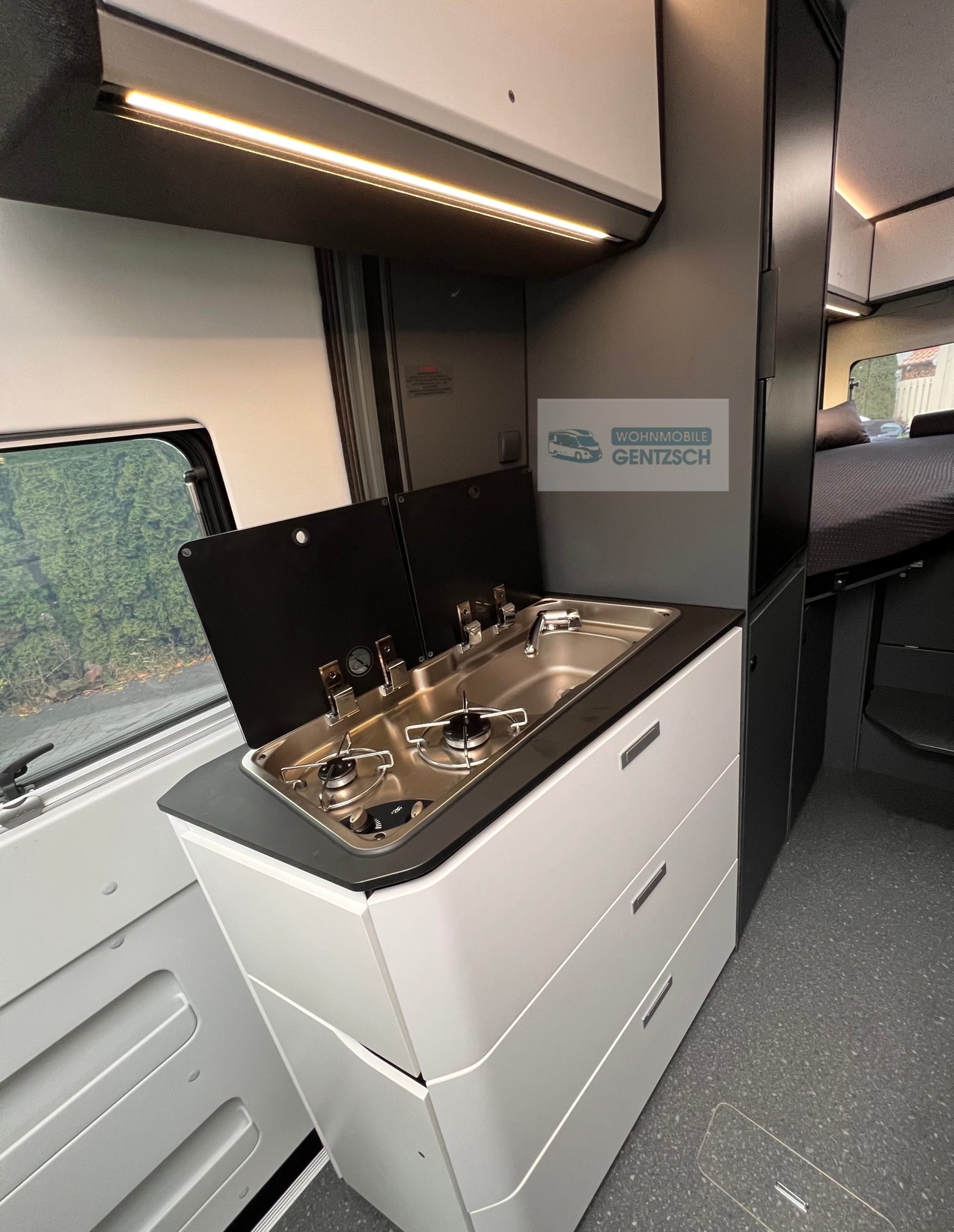 Küche: Die Küchenzeile ist mit einem Zweiflammenkocher, einer Spüle und viel Stauraum in Form von großen Schubladen ausgestattet.